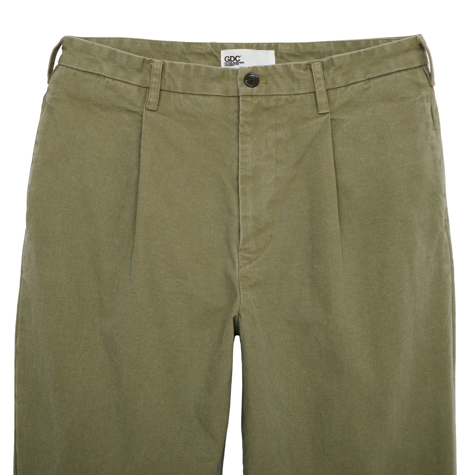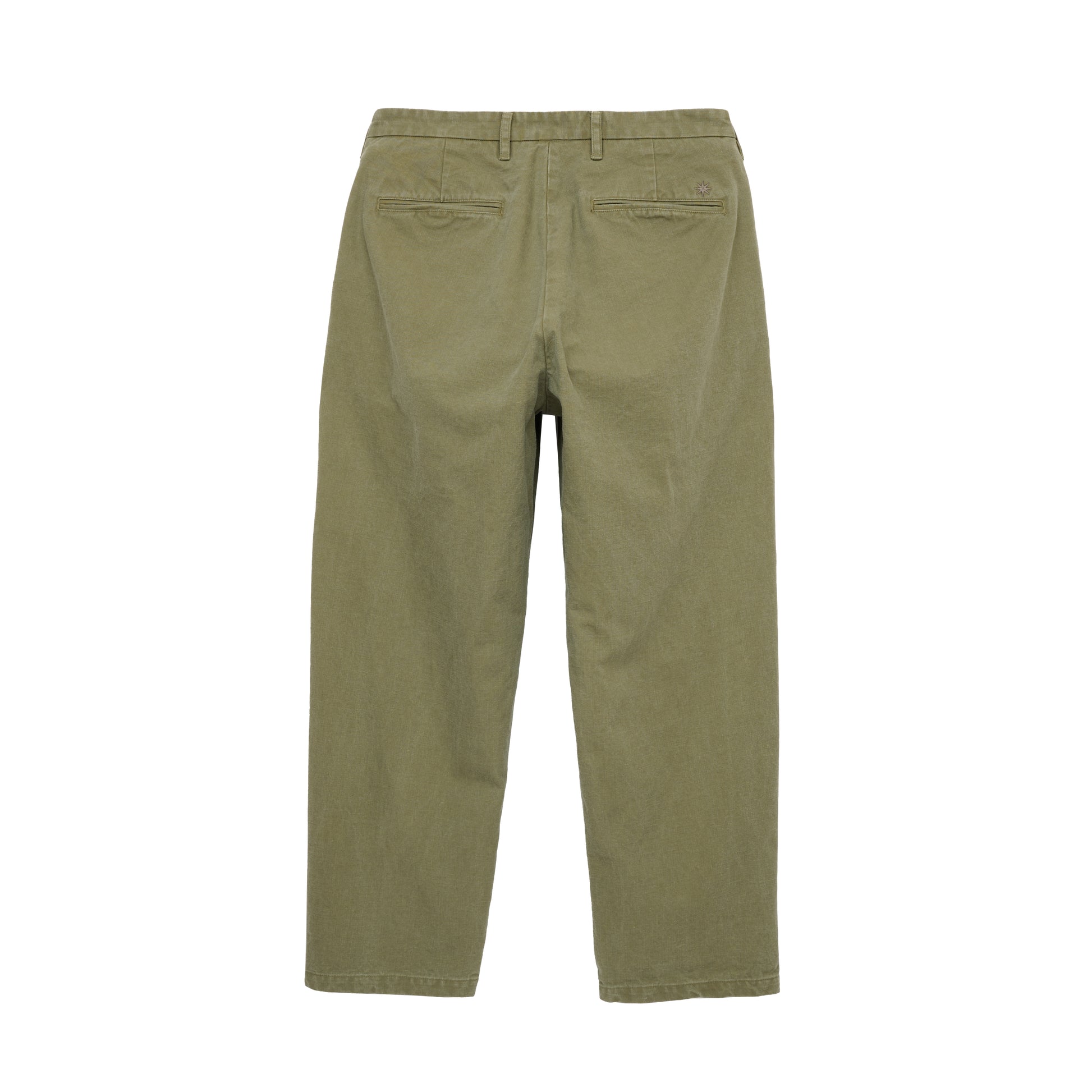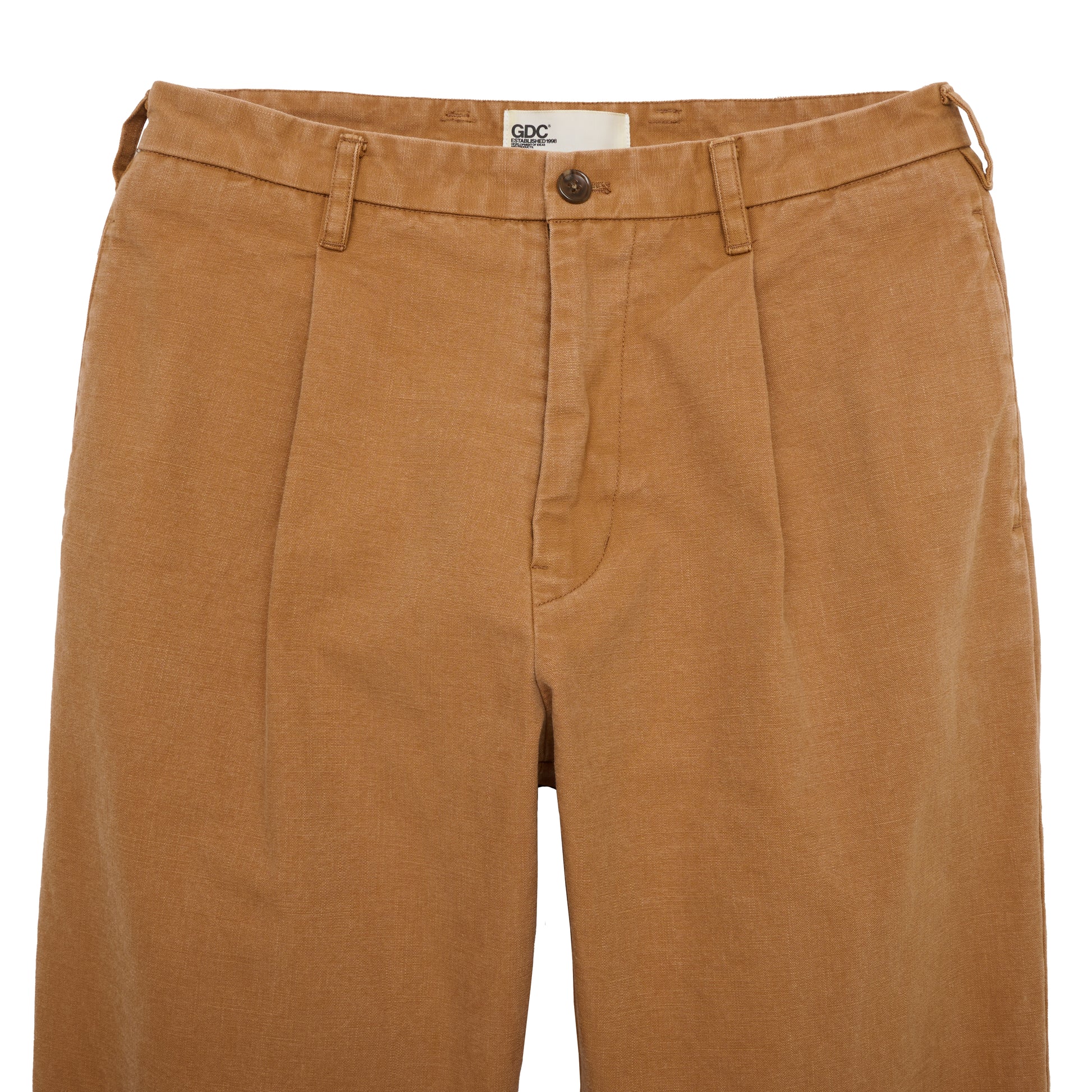 約15年前、熊谷がヴィンテージのバイイングで全米を巡っていた際、ペンシルバニアで出会った一着のアーミッシュジャケットが、その原点となりました。ボロボロのコーデュロイ素材で、もはや日常着としては成立しない状態だったものの、その美しい佇まいに強く惹かれ、アートピースとして購入。後に自身のブランドでデニム素材を用いて製作したところ非常に好評を博し、「いつかまたこの形を作りたい」という想いが生まれました。そして今回、GDCの再始動を機に、その記憶の断片をダック生地で現代に再構築。クラシックで無骨な印象を保ちながらも、上品な空気を纏う大人のセットアップとして蘇らせました。股上を深めにとり、ヒップから腿まわりにかけてはゆとりを持たせながらも、裾にかけて美しくテーパードしたシルエット。背面右ポケット上にはGDCを象徴する8芒星の“STA”モチーフ刺繍をあしらい、無骨さの中に品格を宿すディテールに仕上げました。機能と美意識が共存する、知的でエレガントな“アーミッシュスタイル”をGDCらしく再解釈した一着です。