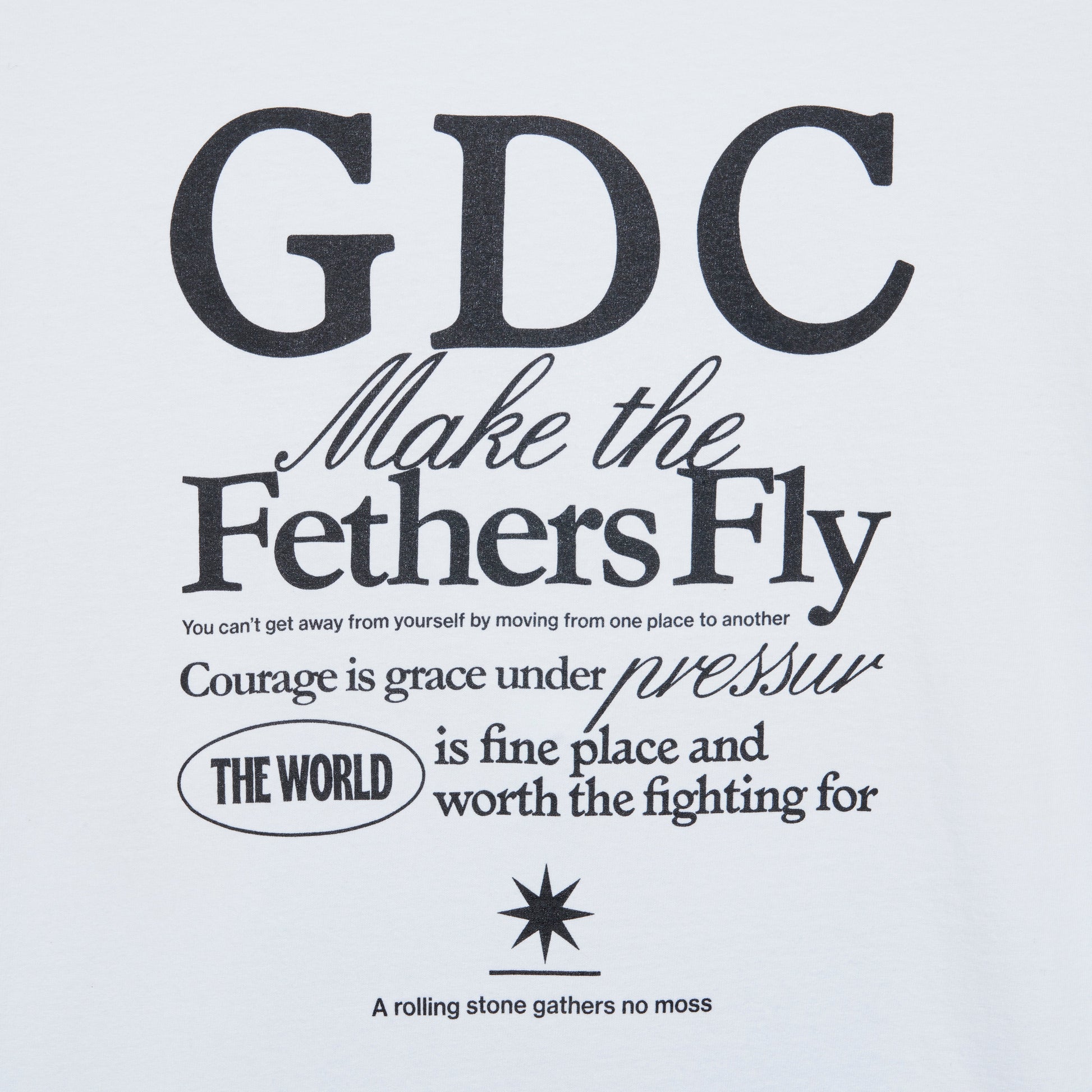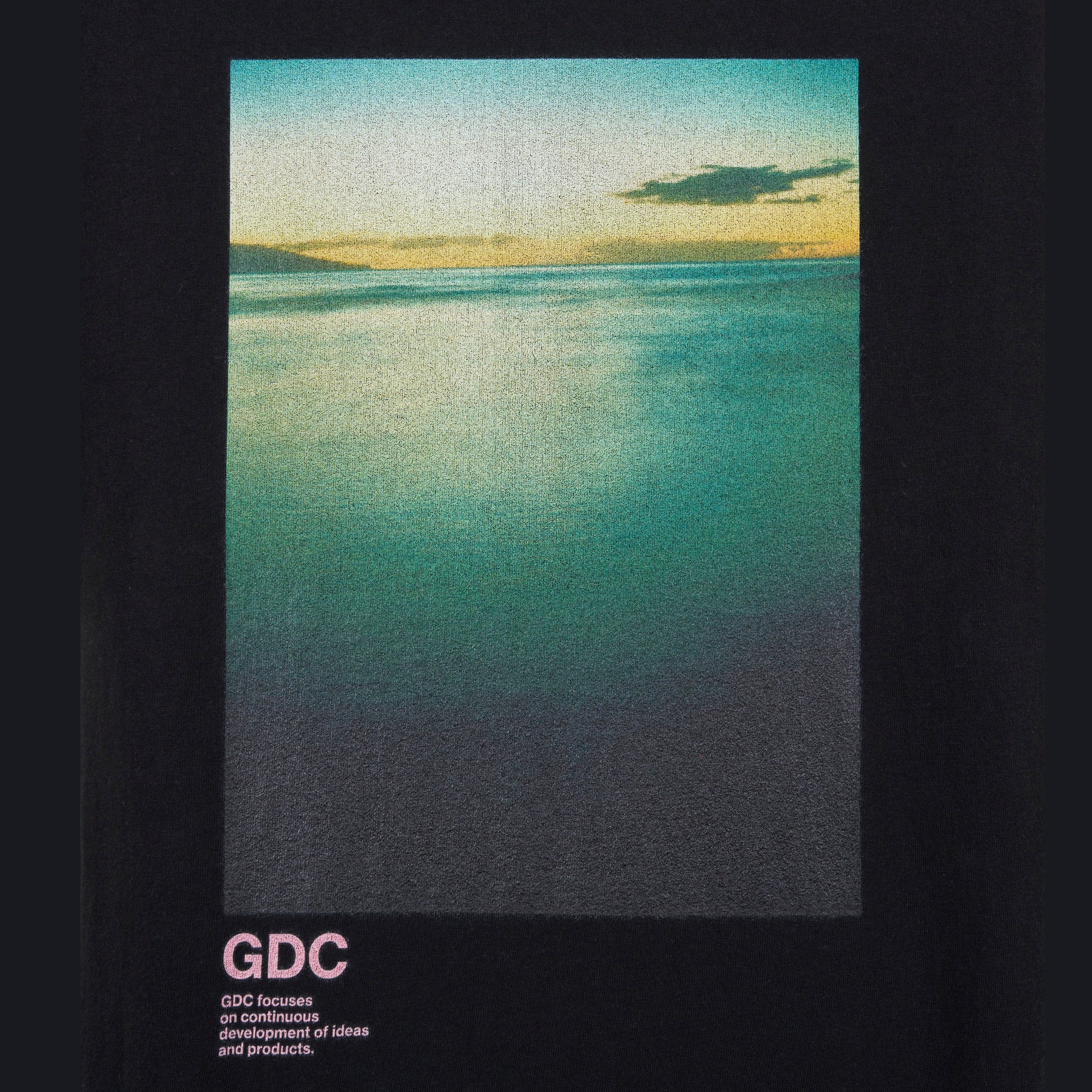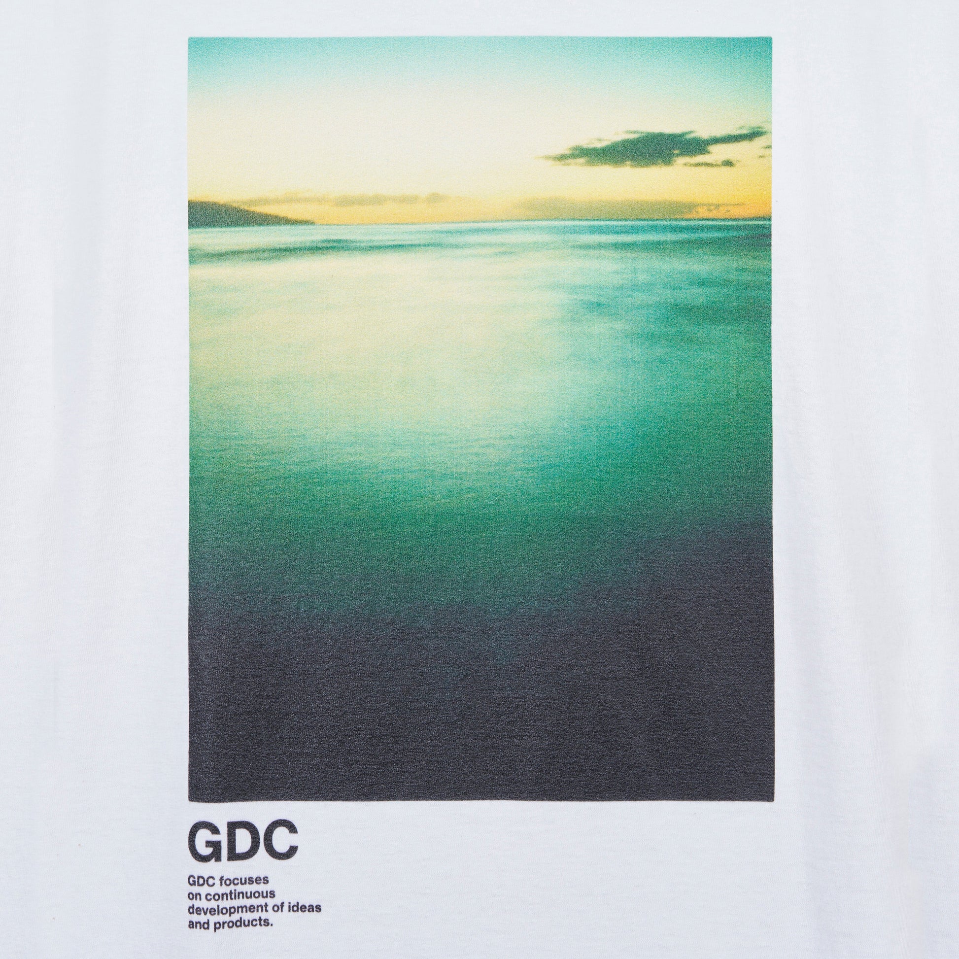 フロントに降谷建志氏の所有するディレクター熊谷が撮影したランドスケープのフォトをインクジェントプリント、背面には“GDC”、“MAKE THE FEATHERS FLY”(騒ぎを起こす、の意)のレターグラフィックをラバープリントで表現したデザイン。