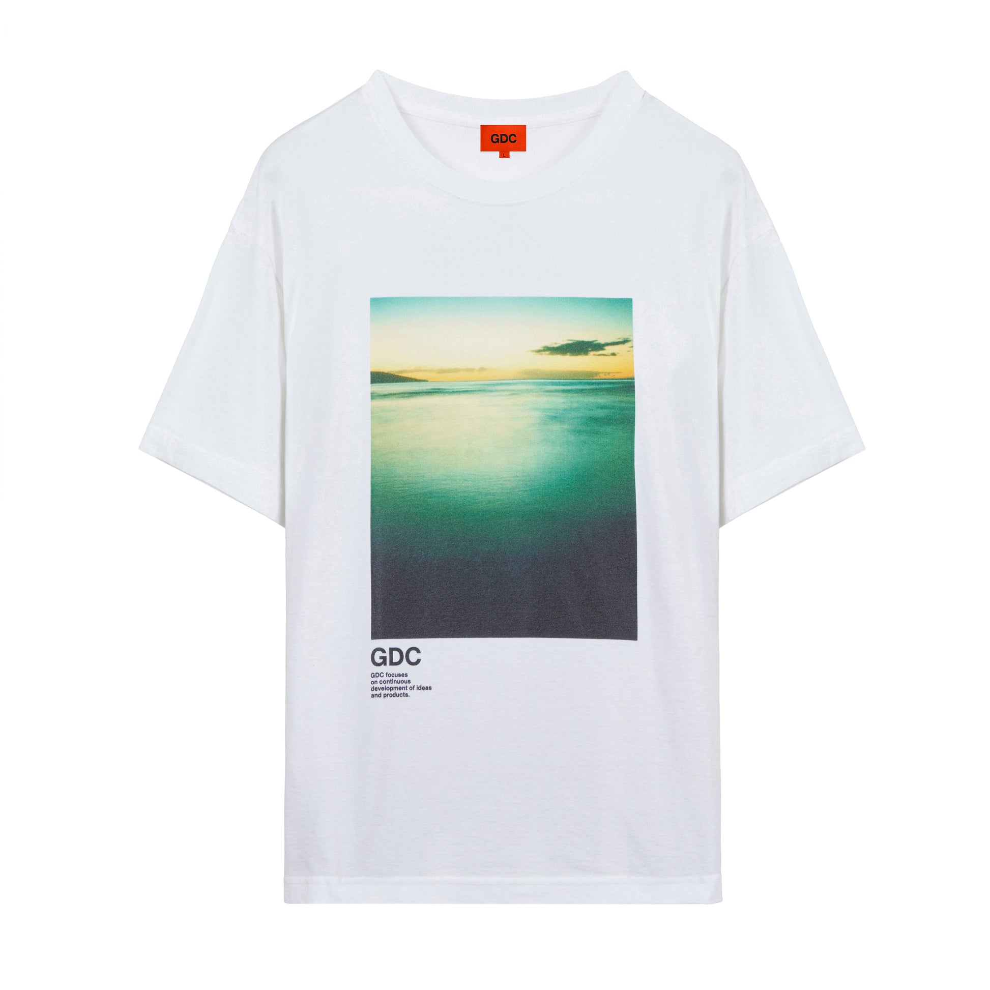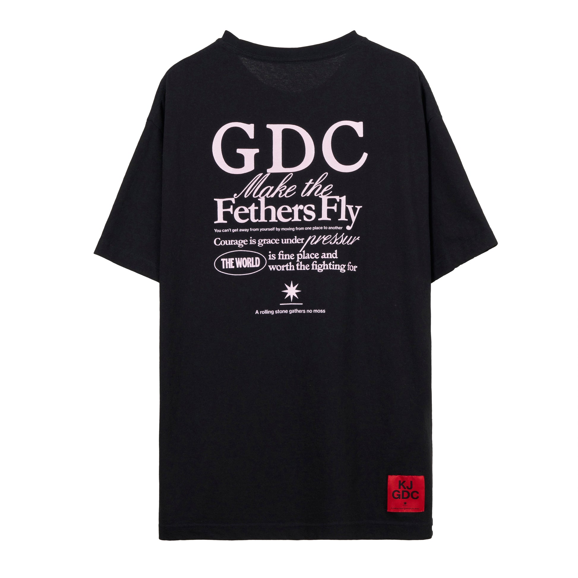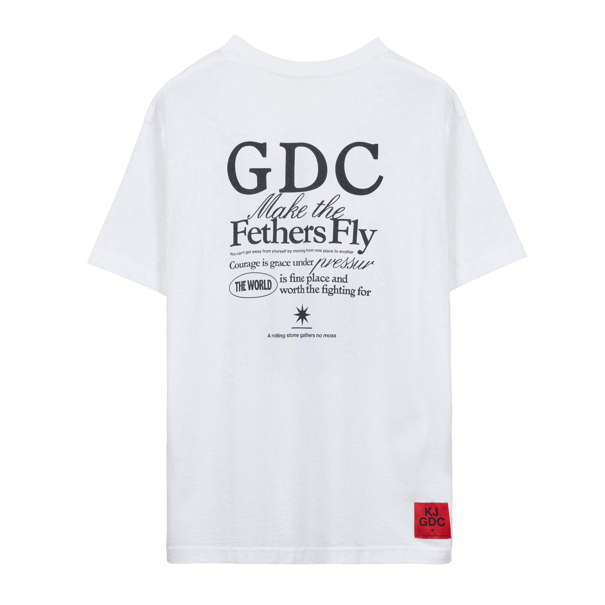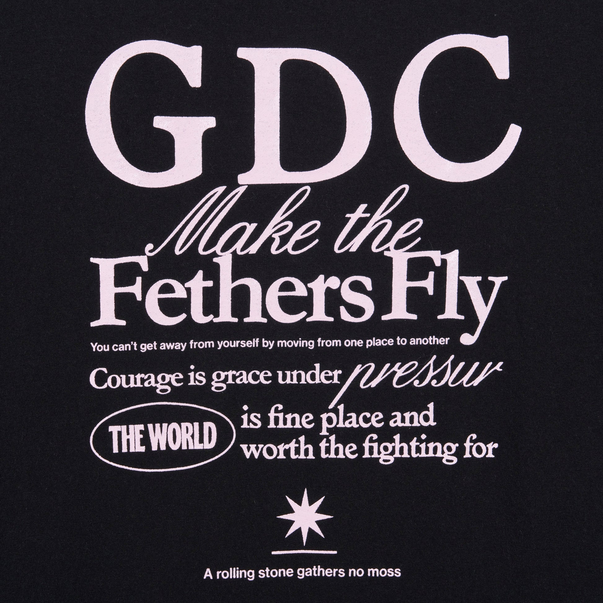フロントに降谷建志氏の所有するディレクター熊谷が撮影したランドスケープのフォトをインクジェントプリント、背面には“GDC”、“MAKE THE FEATHERS FLY”(騒ぎを起こす、の意)のレターグラフィックをラバープリントで表現したデザイン。