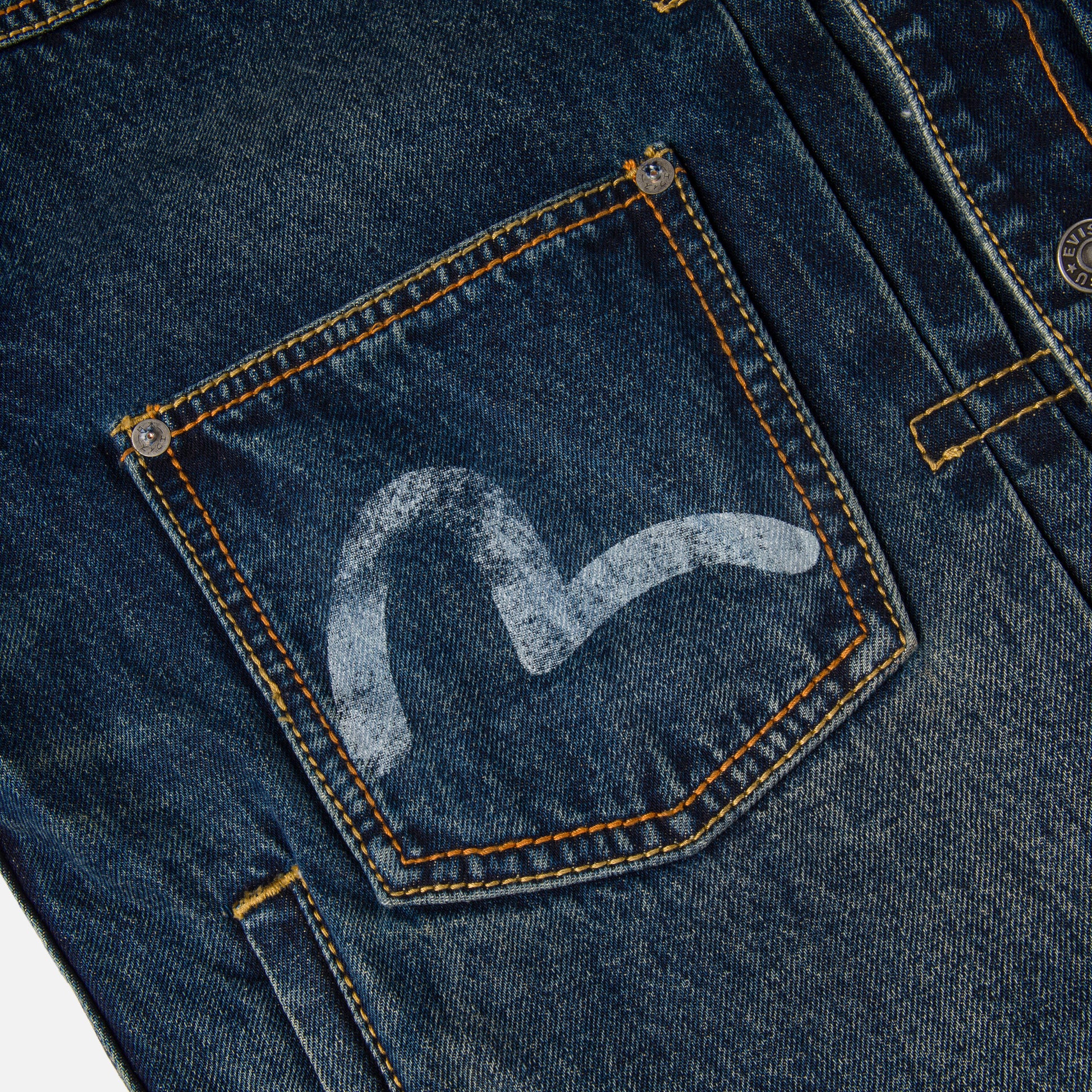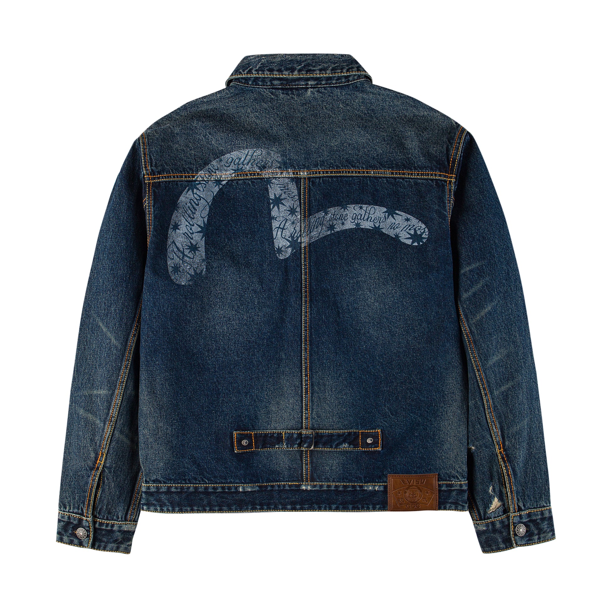 ウォッシュ加工で仕上げたヴィンテージ風デニムジャケットに、GDCとのコラボレーションならではの大胆なバックデザインをオン。背面には、EVISUの象徴的なカモメロゴの中に “A rolling stone gathers no moss.” のメッセージと8芒星のグラフィックがアクセントを添え 唯一無二の存在感を放つ一着。同シリーズの[EVISU X GDC WASHED 5P RELAX FIT JEANS]とセットアップでの着用もおすすめ。