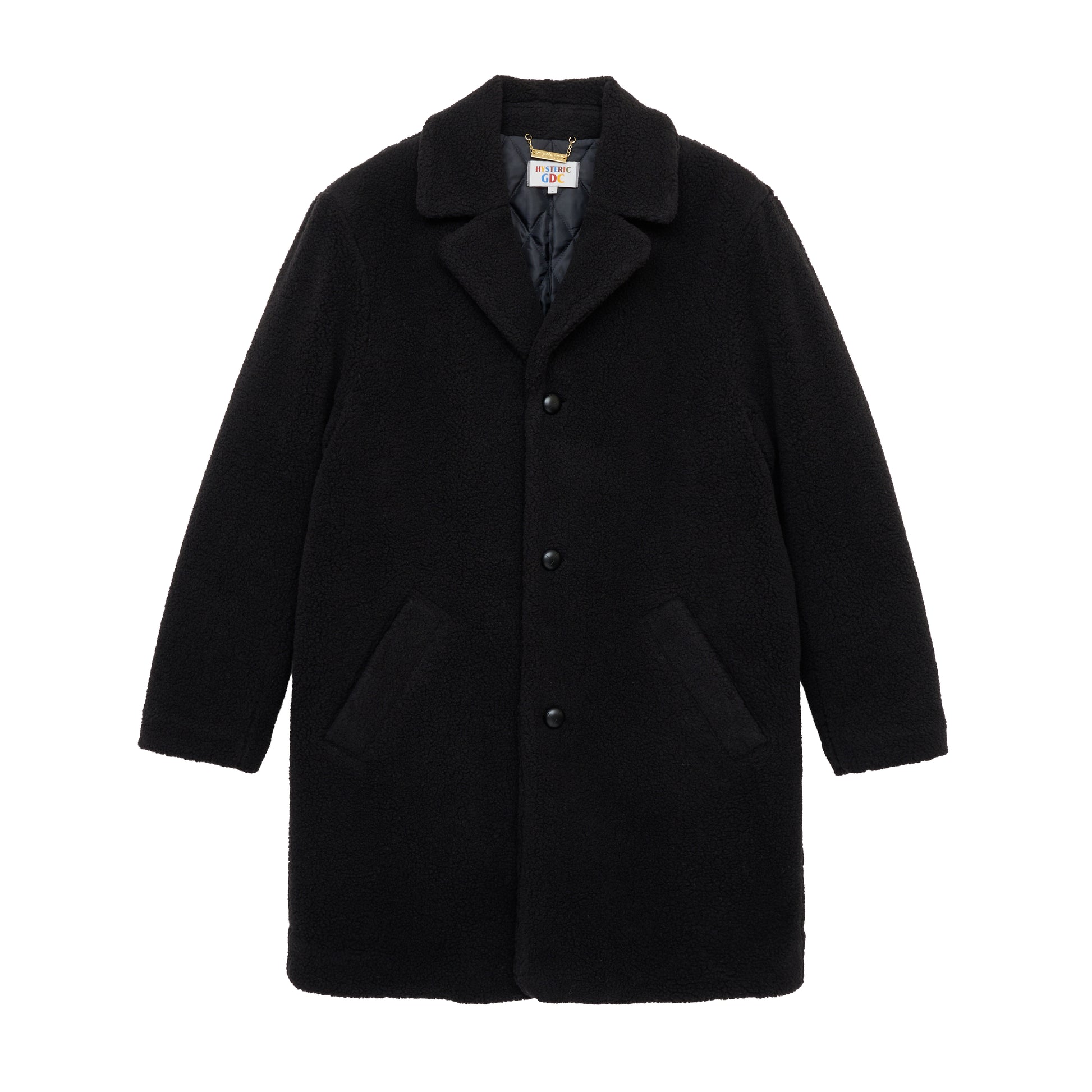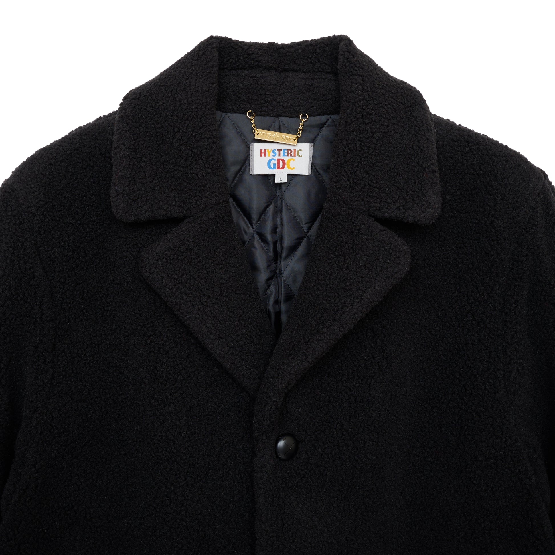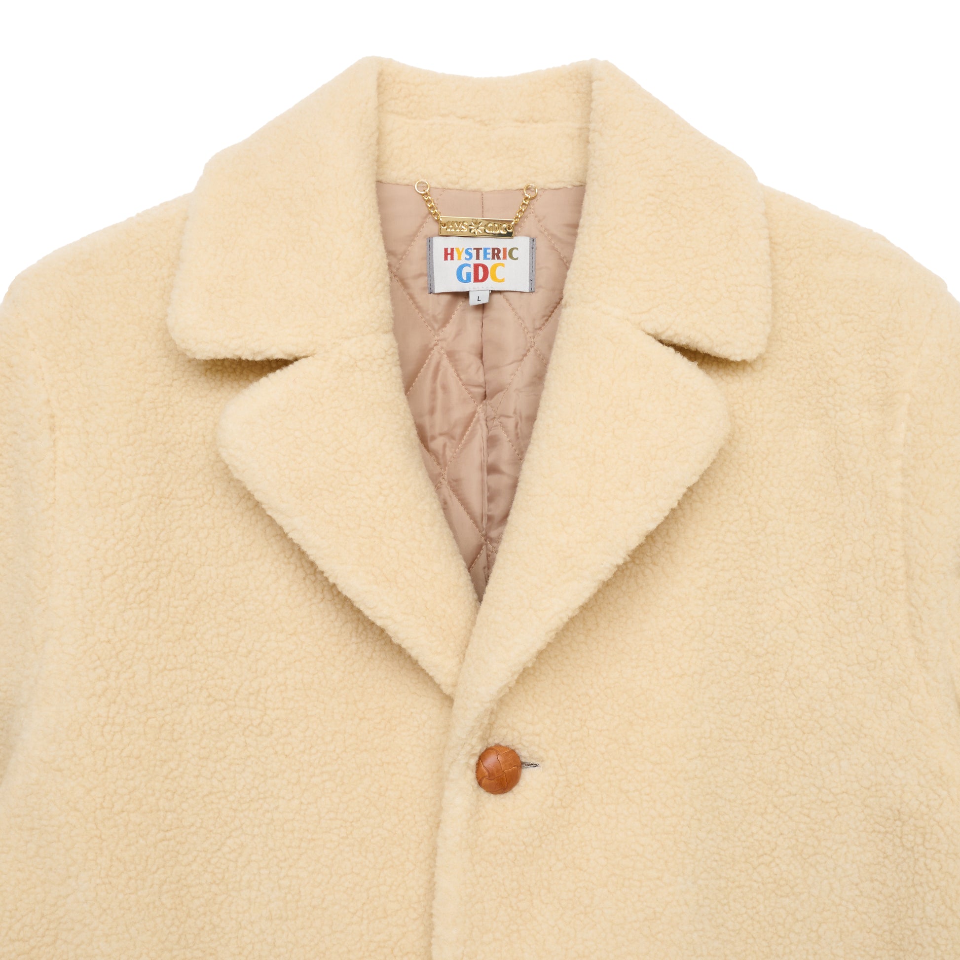 丈感のあるボアジャケット。シーズンムードを高める柔らかなボア素材が、見た目にもあたたかな雰囲気を演出します。身幅や袖にゆとりをもたせたシルエットで、肉厚なニットやパーカーの上からも難なく羽織れる実用性も魅力です。ボタンには革くるみのアクセントを加え、程よい上質感をプラス。背面には〈HYSTERIC GLAMOUR × GDC〉のコラボロゴを配し、さりげなく特別感を添えています。さらにネームタグにはコラボタグと特別仕様のプレートタグをあしらい、細部までこだわった仕上がりに。
