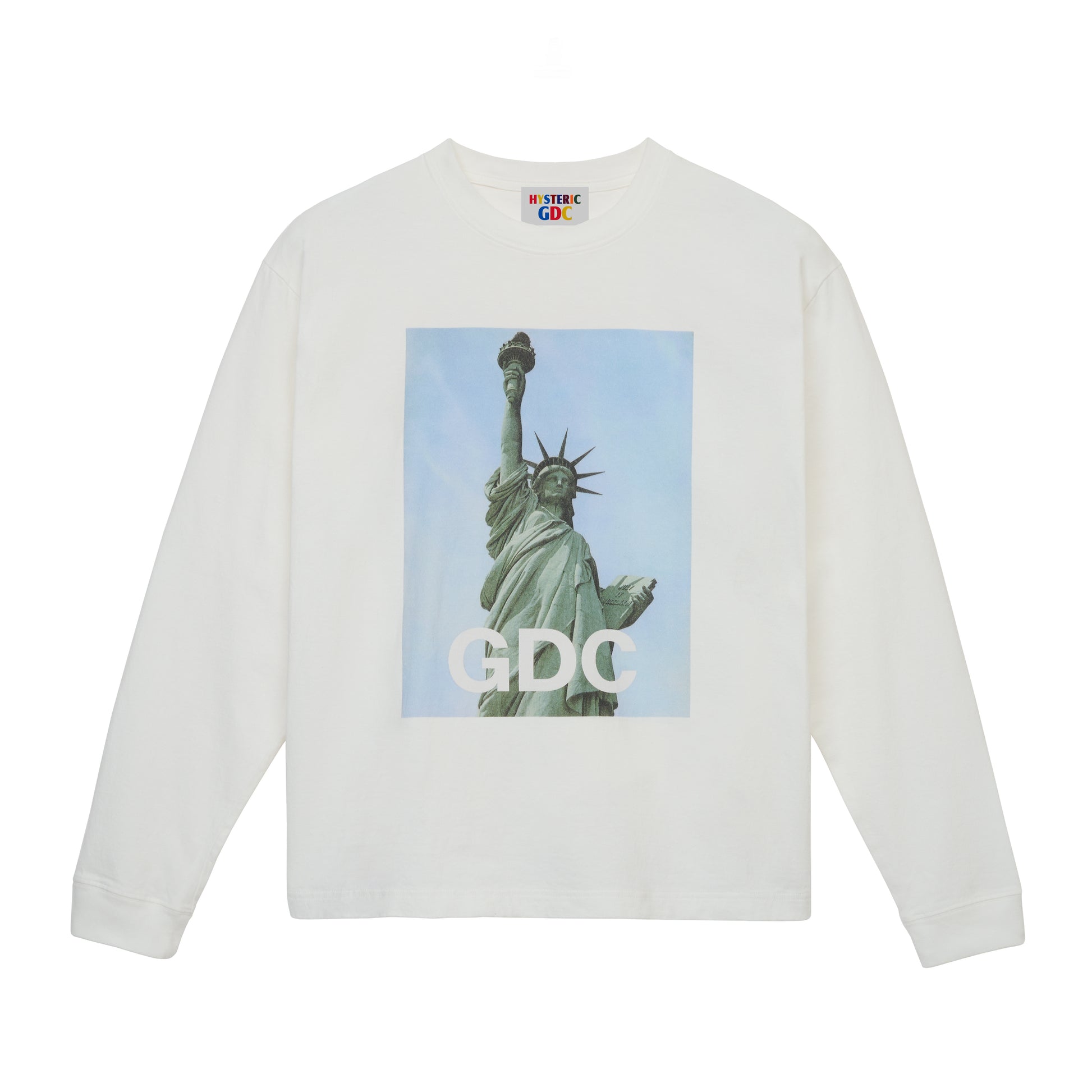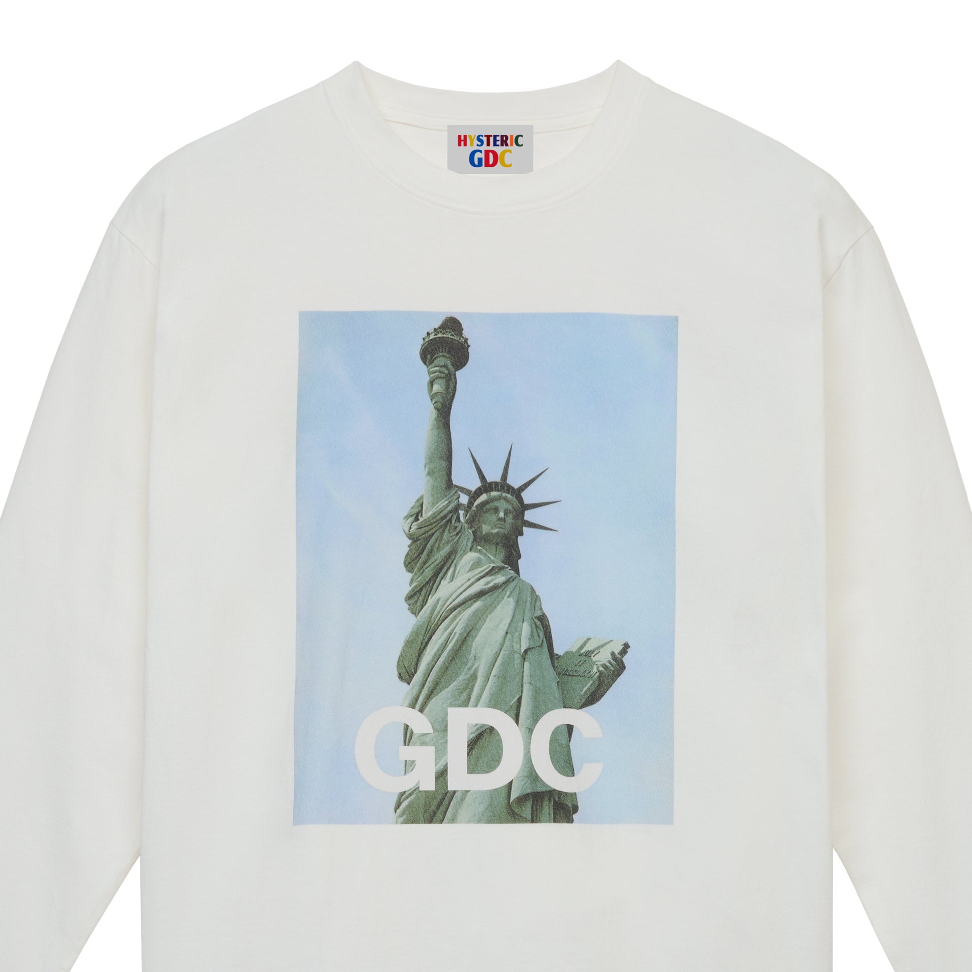 自由の女神の写真に「GDC」の文字を大胆にレイアウトした、新規デザインならではの鮮度を持つ一枚です。象徴的なモチーフにあえてストレートなタイポグラフィを重ねることで、HYSTERIC GLAMOURらしいアートとユーモアのバランスが際立ち、シンプルなスタイリングにも強いアクセントとして取り入れられます。ミニマルな構成の中に確かな視点を感じさせる、印象的な一枚です。