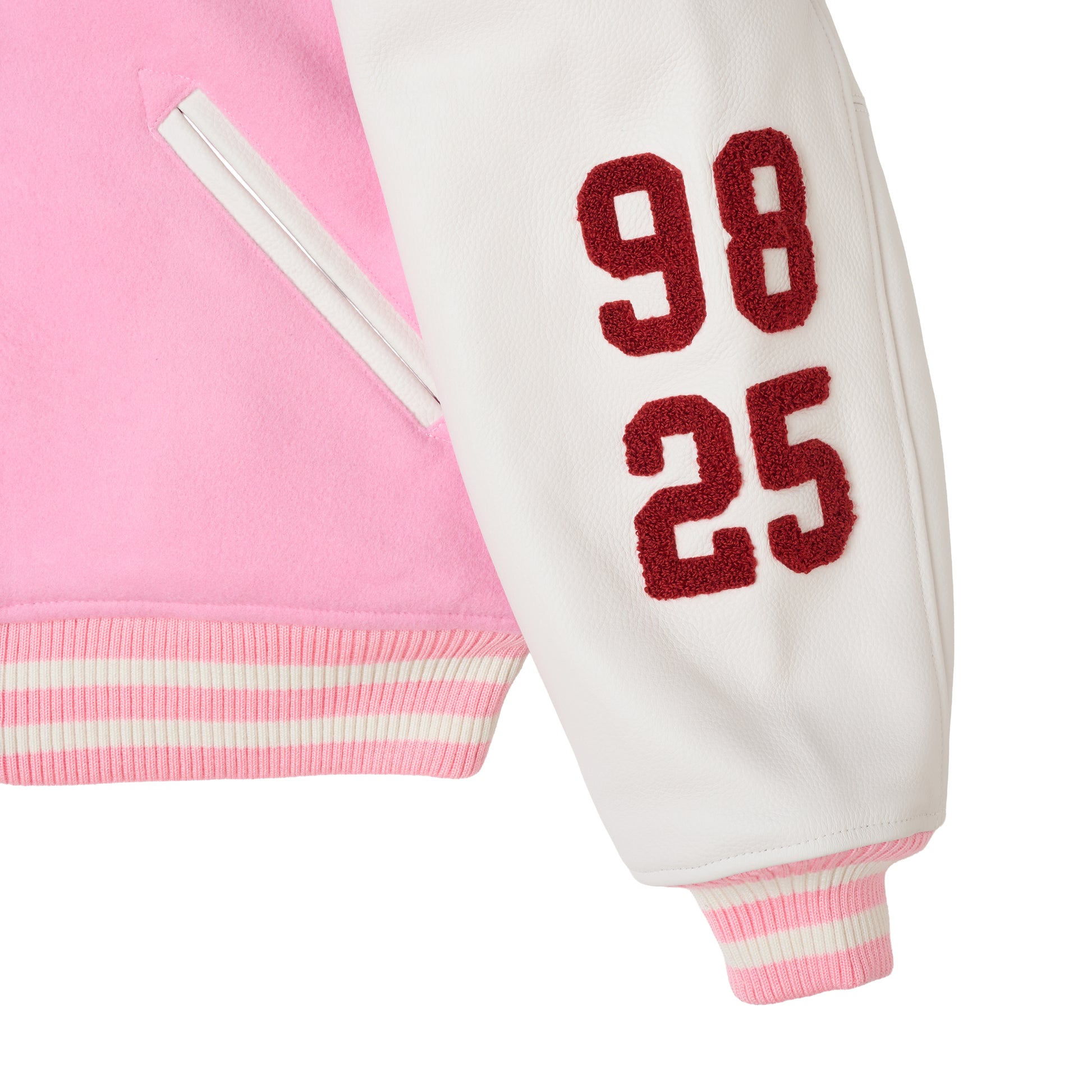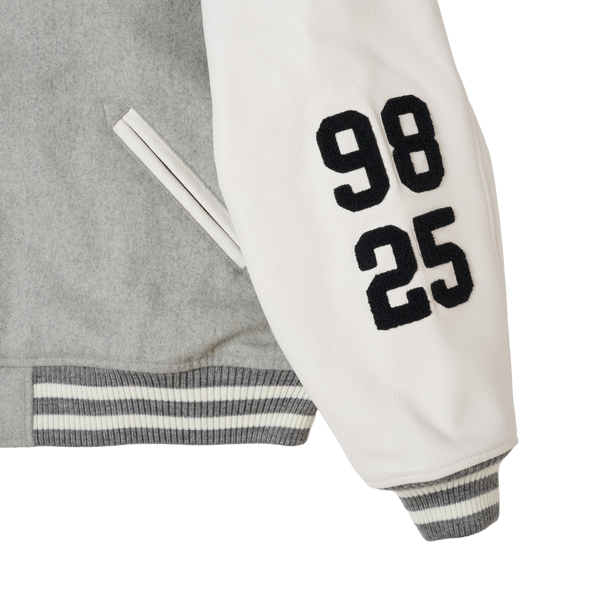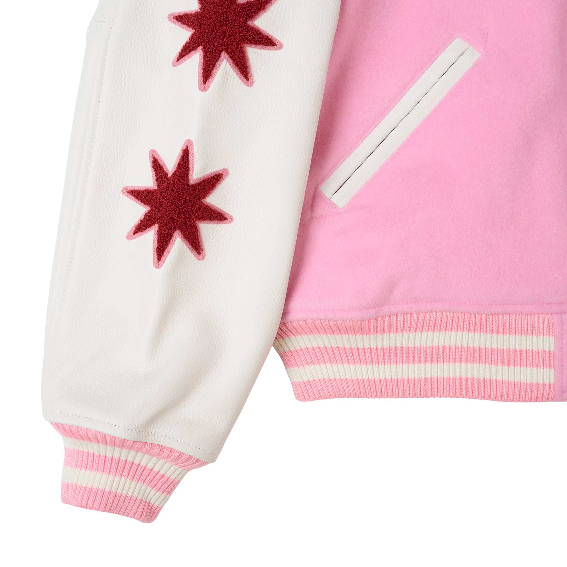 スナップ付きの前立てやストライプリブの裾、さがら刺繍やワッペンなど、スタジャンらしいディテールをしっかり効かせ、ヴィンテージの風合いと程よい厚みをもたせた仕上がりに。コラボレーションならではの遊び心あふれるアートワークがポイントで、背面には8芒星の中にRS5ロゴを、右袖には8芒星、左袖にはブランド誕生の1998〈98〉と、再始動を迎えた2025〈25〉のナンバーをオン。ピンク、グレー、ブラックの3色で展開し、オーバーサイズで仕立てたシルエットは、メンズライクにもジェンダーレスにも楽しめる一着です。