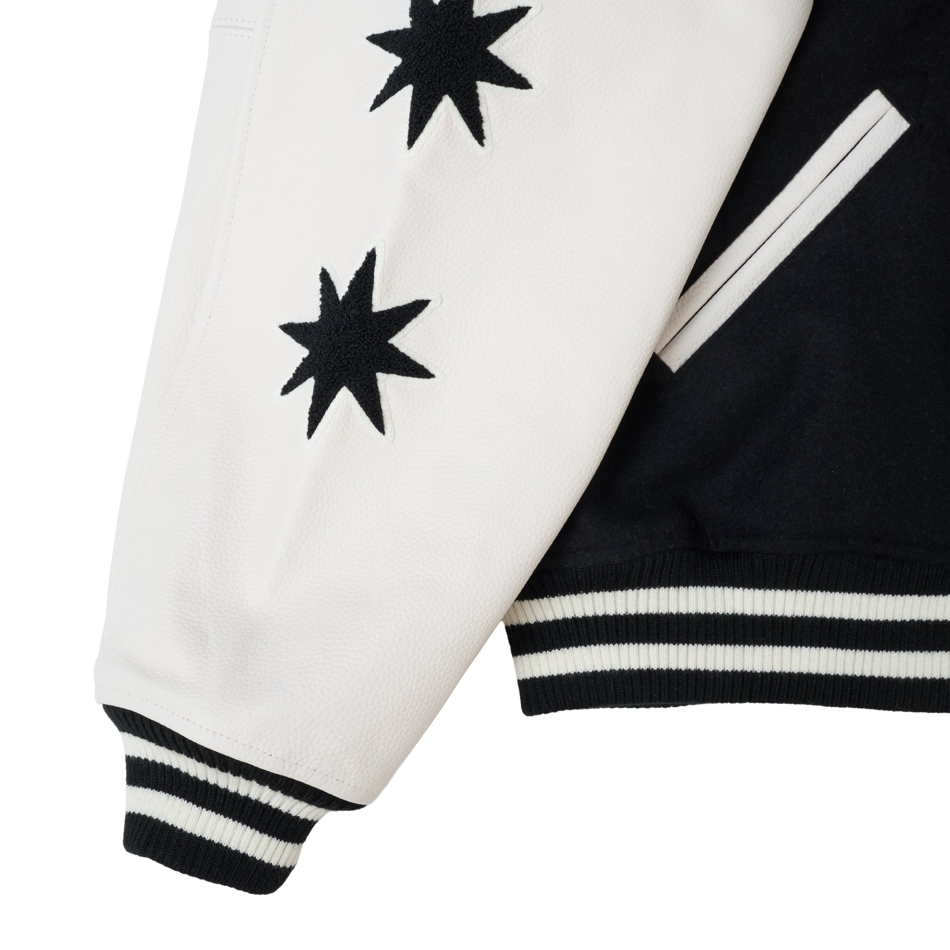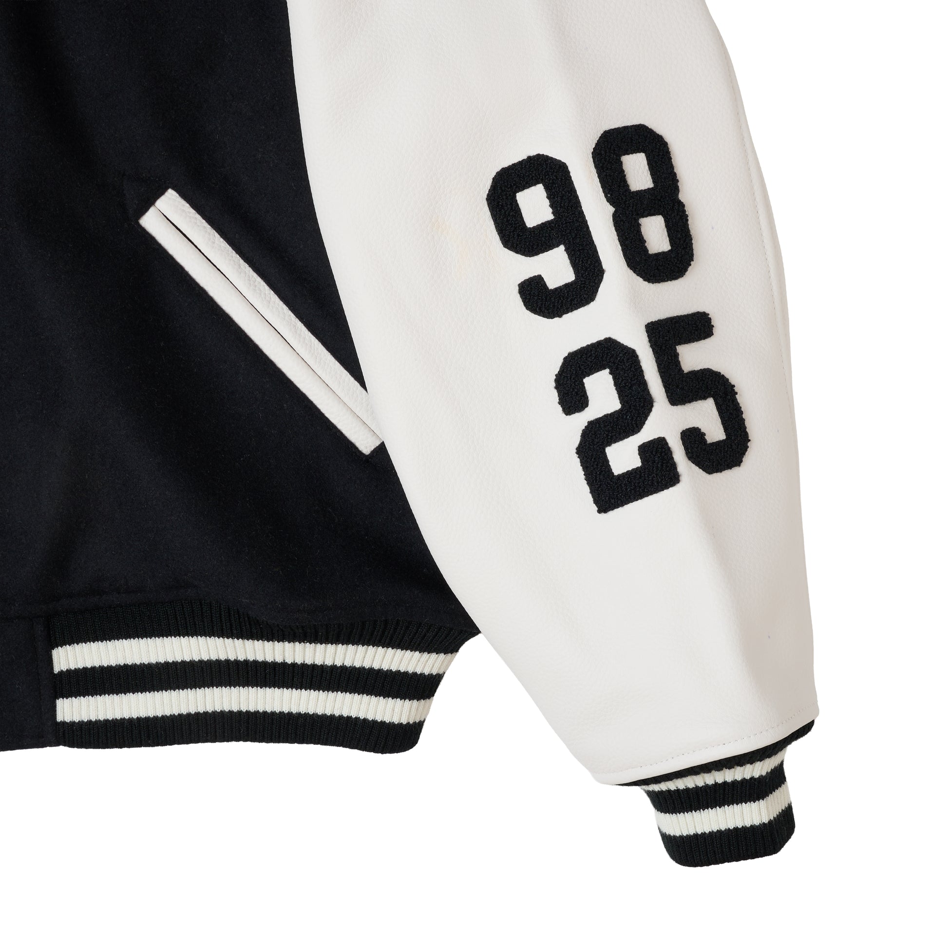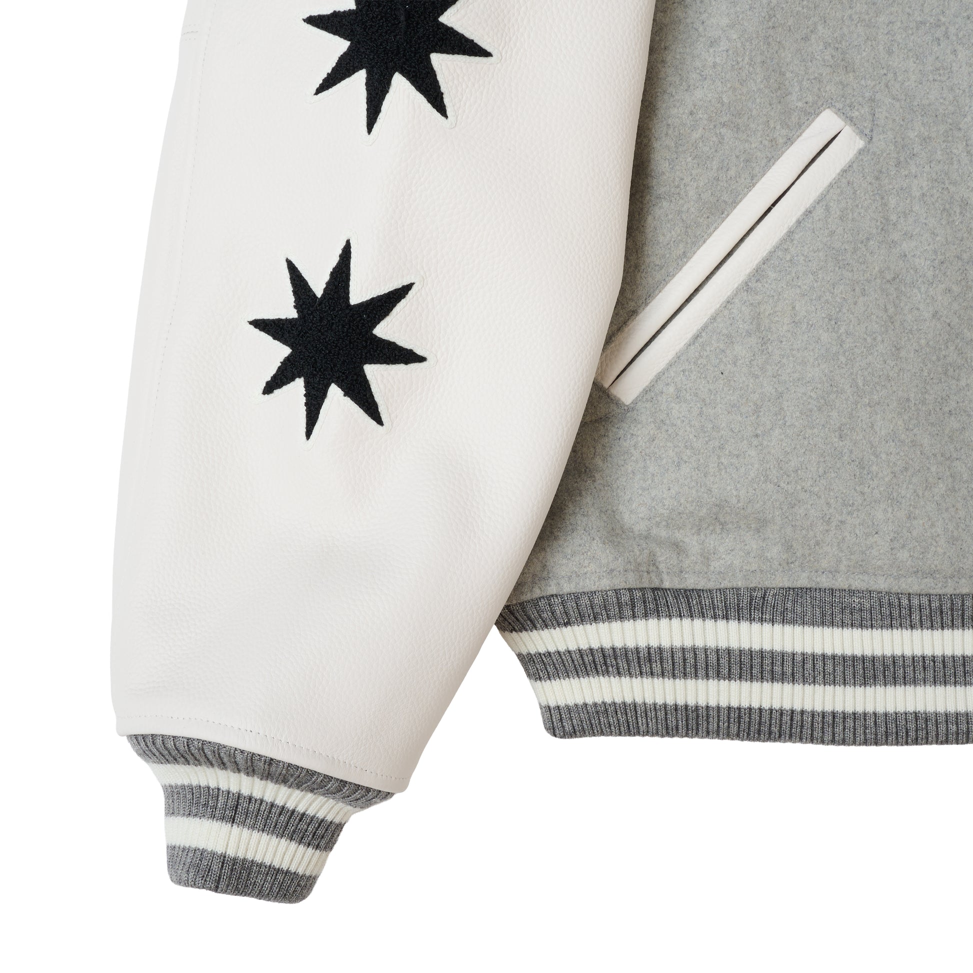 スナップ付きの前立てやストライプリブの裾、さがら刺繍やワッペンなど、スタジャンらしいディテールをしっかり効かせ、ヴィンテージの風合いと程よい厚みをもたせた仕上がりに。コラボレーションならではの遊び心あふれるアートワークがポイントで、背面には8芒星の中にRS5ロゴを、右袖には8芒星、左袖にはブランド誕生の1998〈98〉と、再始動を迎えた2025〈25〉のナンバーをオン。ピンク、グレー、ブラックの3色で展開し、オーバーサイズで仕立てたシルエットは、メンズライクにもジェンダーレスにも楽しめる一着です。