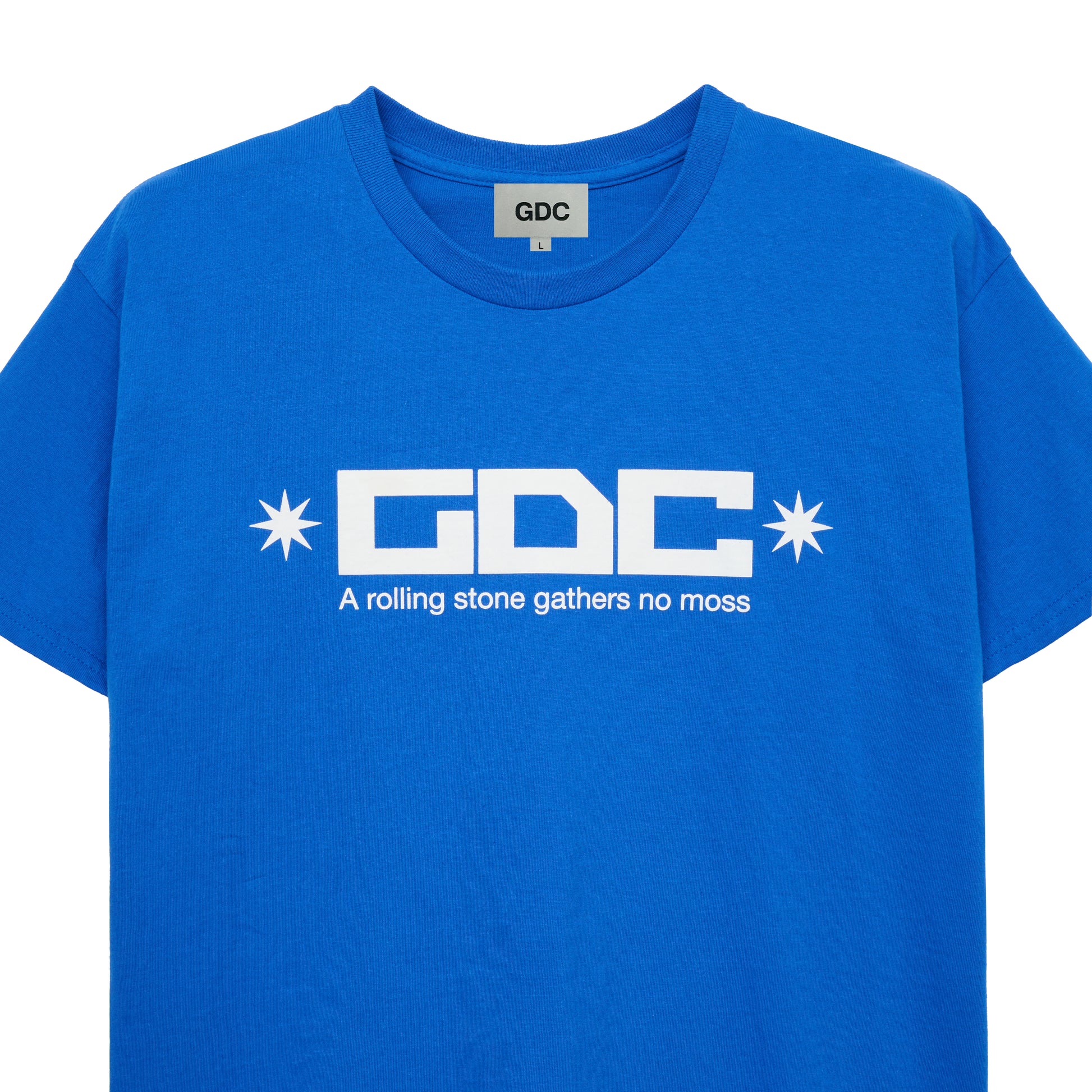 ドライタッチなコットン天竺素材を使用したショートスリーブTシャツ。フロントにGDCロゴと8芒星のSTAモチーフ、さらに “a rolling stone gathers no moss”(転石苔むさず)を配したレターグラフィックを大きくラバープリントで表現。バックにも8芒星のSTAモチーフを配置。ブランドのアイデンティティを語るうえで欠かせない要素を1枚に落とし込んだ、GDC復活にふさわしい仕上がり。象徴的なディテールが詰まった、ファンならぜひ手に入れておきたいアイテム。印象を引き立てるブルー、定番で合わせやすいホワイト、シンプルに決まるブラックの3色3サイズ展開。